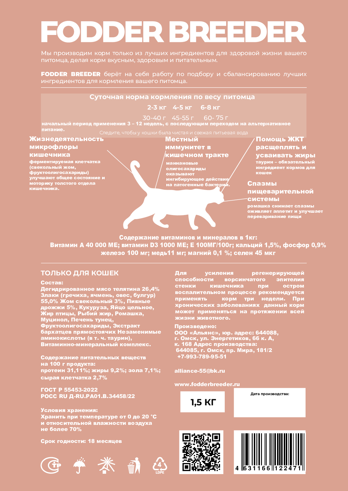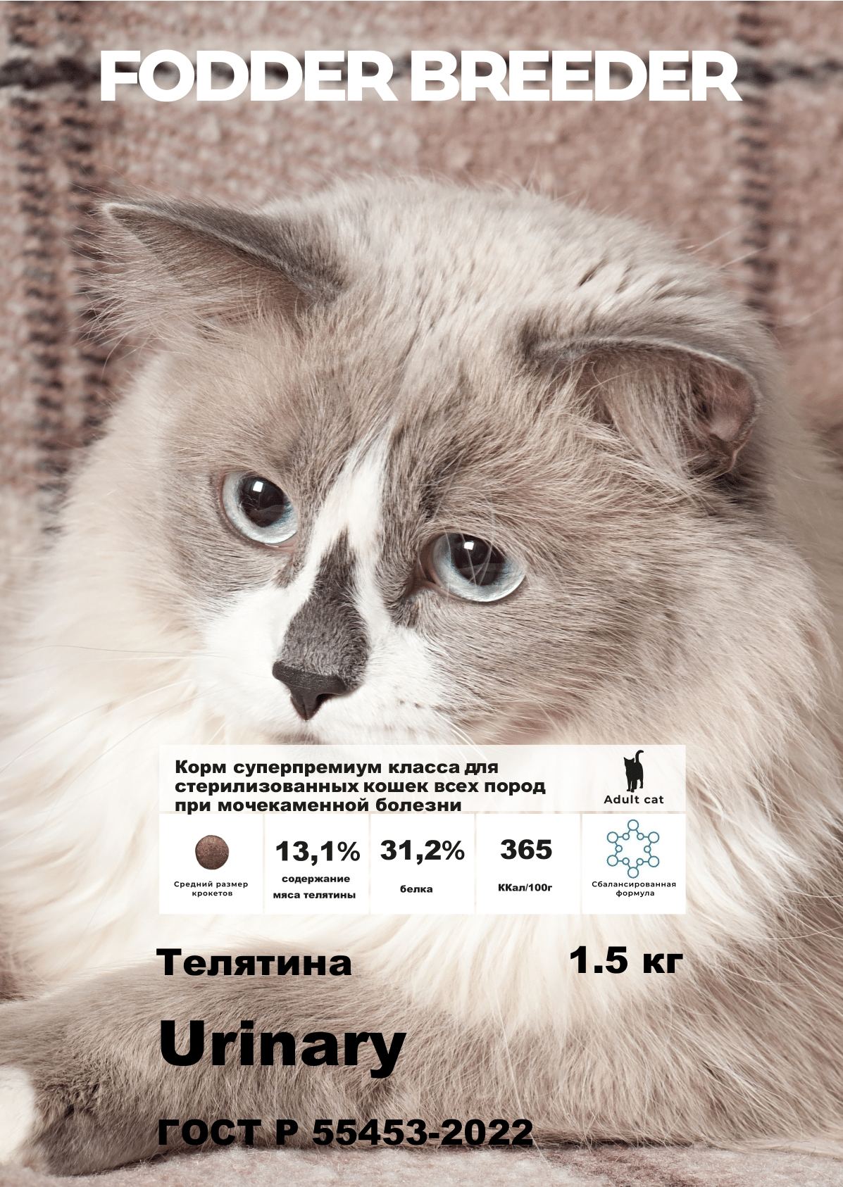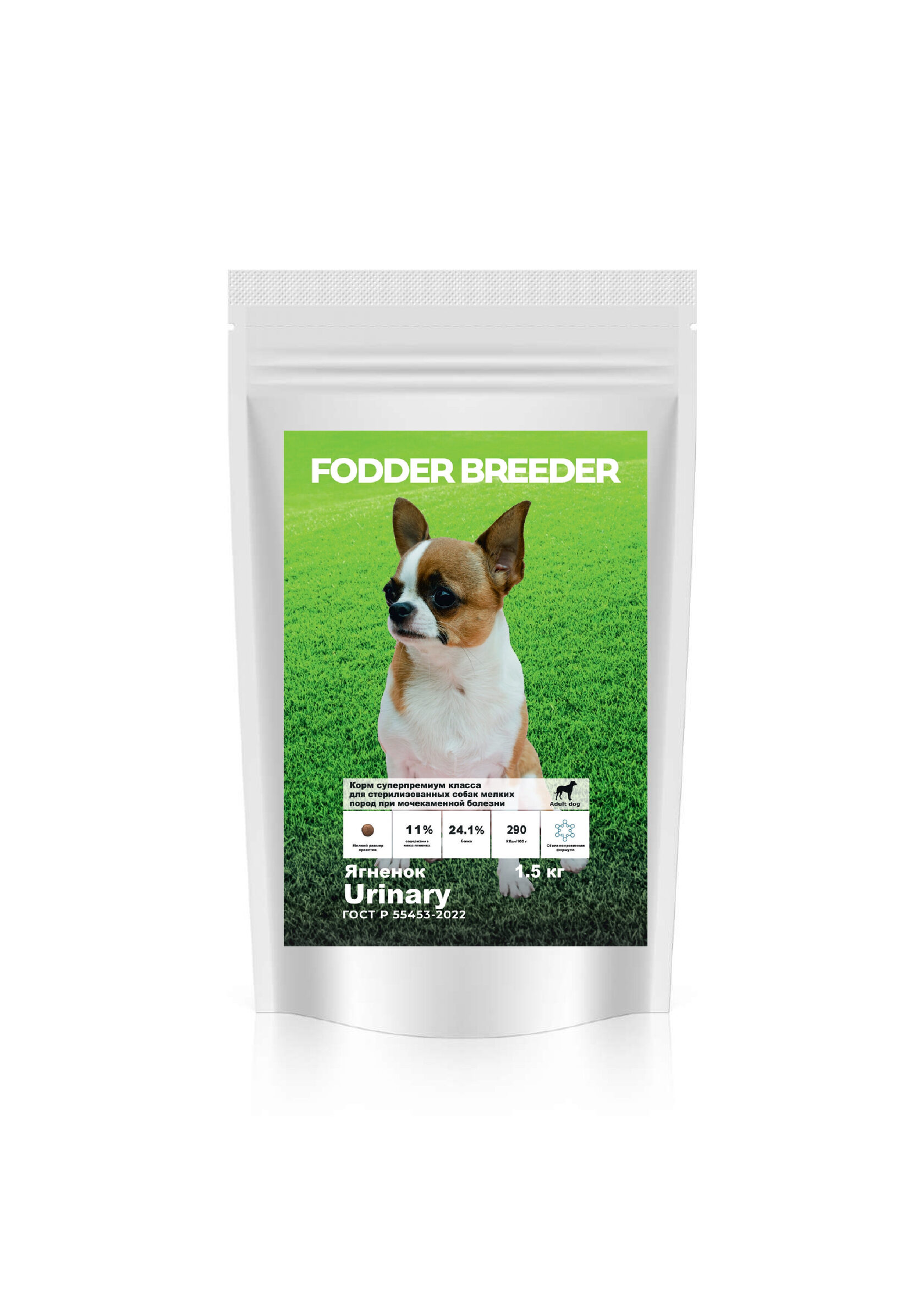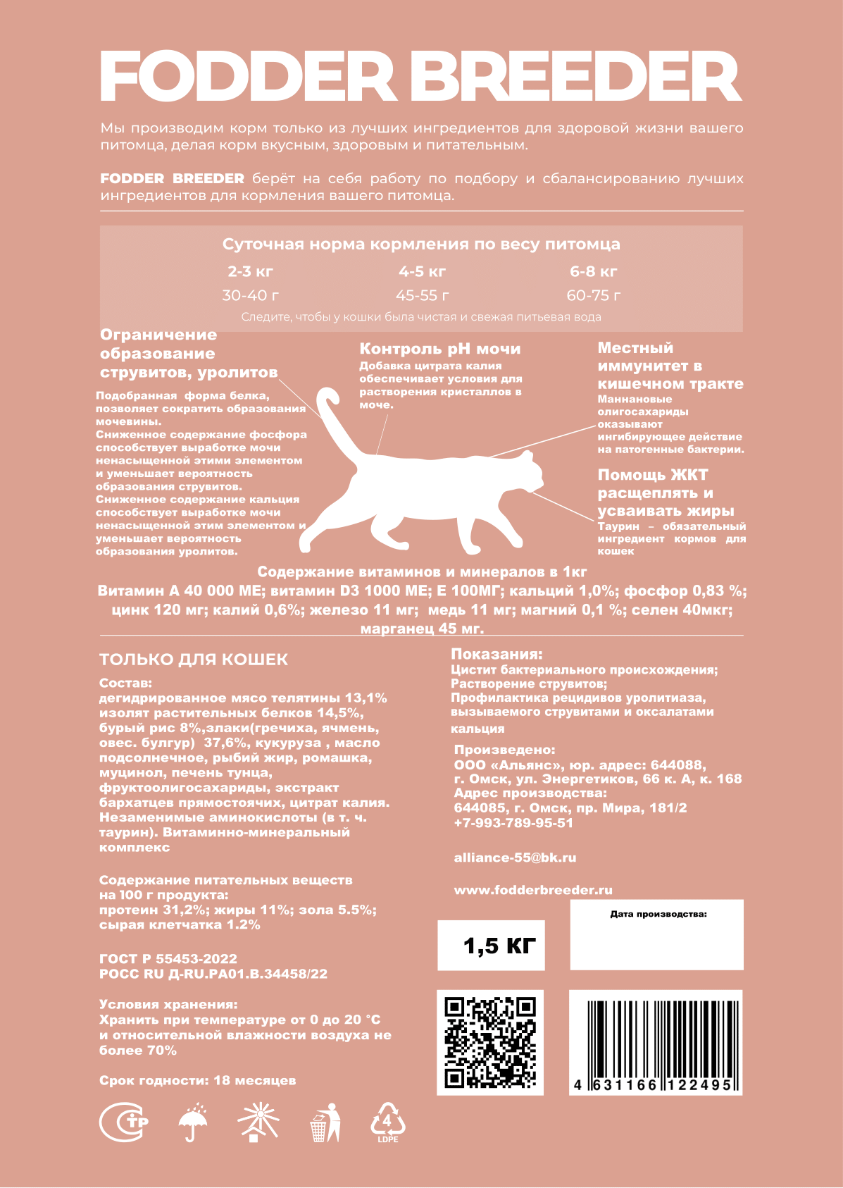 Показания: Цистит бактериального происхождения, * Растворение струвитов, *Профилактика рецидивов уролитиаза, вызываемого струвитами и оксалатами кальция, * Перед назначением пожилым животным корма FODDER BREEDER для собак при мочекаменной болезни, необходимо убедиться в нормальном функционировании их почек. Противопоказания: Беременность, лактация, рост, * Хроническая почечная недостаточность, нарушение обмена веществ, * Панкреатит (в т. ч. перенесенный ранее), * Гиперлипидемия, * Сердечная недостаточность, *Назначение лекарственных препаратов, вызывающих подкисление мочи Состав: Злаки(гречиха, ячмень, овес.булгур) 22,3%, Кукурузный глютен 15%, Изолят растительного белка 14,7%, Дегидрированное мясо индейки 11%, Бурый рис 10%, Пульпа сахарной свеклы, Яичный порошок, Масло подсолнечное, Рыбий жир, Жир птицы, DL- метионин, Ромашка, Муцинол, Печень тунец, Фруктоолигосахариды, Экстракт бархатцев прямостоячих, Цитрат калия, Незаменимые аминокислоты, Витаминно-минеральный комплекс