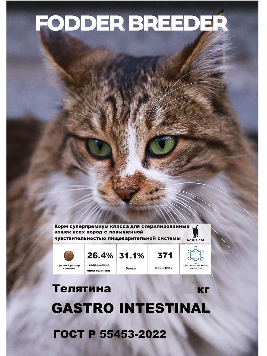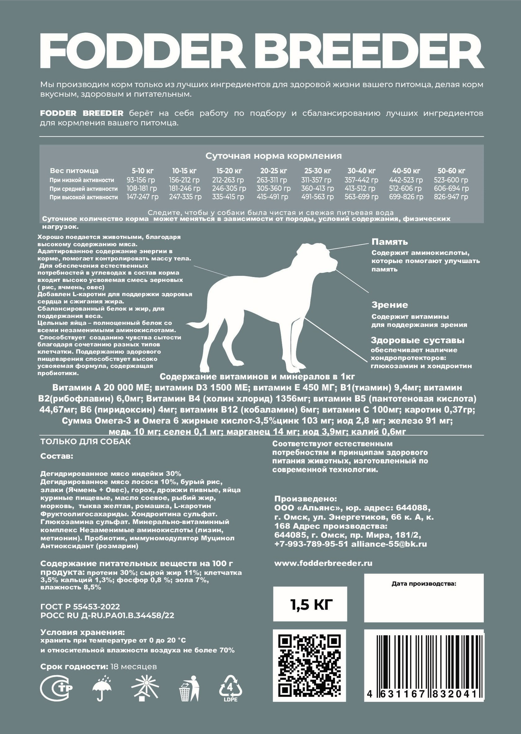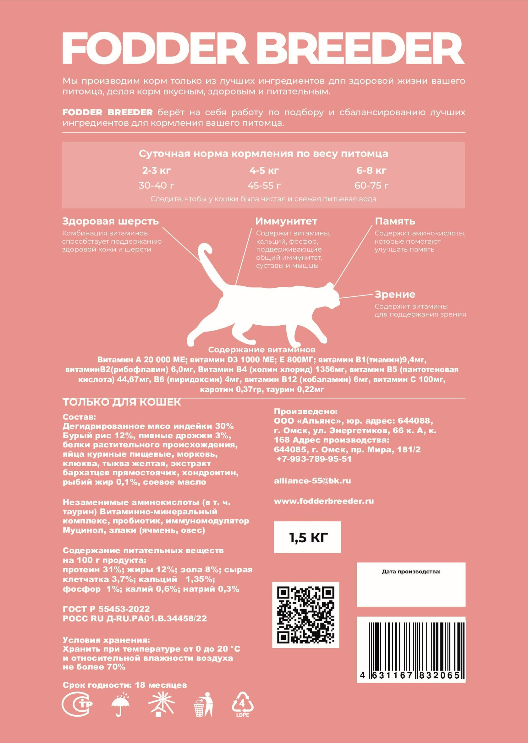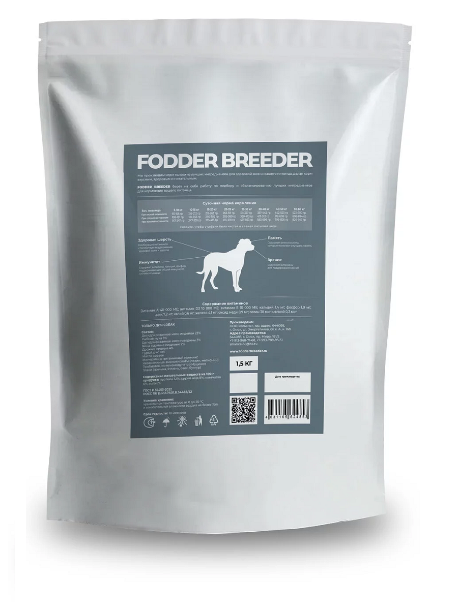 Показания: Цистит бактериального происхождения, * Растворение струвитов, *Профилактика рецидивов уролитиаза, вызываемого струвитами и оксалатами кальция, * Перед назначением пожилым животным корма FODDER BREEDER для собак при мочекаменной болезни, необходимо убедиться в нормальном функционировании их почек. Противопоказания: Беременность, лактация, рост, * Хроническая почечная недостаточность, нарушение обмена веществ, * Панкреатит (в т. ч. перенесенный ранее), * Гиперлипидемия, * Сердечная недостаточность, *Назначение лекарственных препаратов, вызывающих подкисление мочи Состав: Злаки(гречиха, ячмень, овес.булгур) 22,3%, Кукурузный глютен 15%, Изолят растительного белка 14,7%, Дегидрированное мясо индейки 11%, Бурый рис 10%, Пульпа сахарной свеклы, Яичный порошок, Масло подсолнечное, Рыбий жир, Жир птицы, DL- метионин, Ромашка, Муцинол, Печень тунец, Фруктоолигосахариды, Экстракт бархатцев прямостоячих, Цитрат калия, Незаменимые аминокислоты, Витаминно-минеральный комплекс